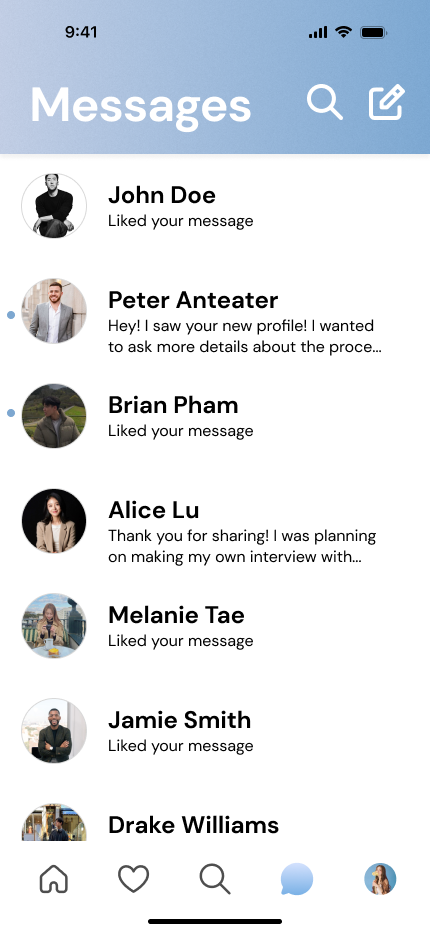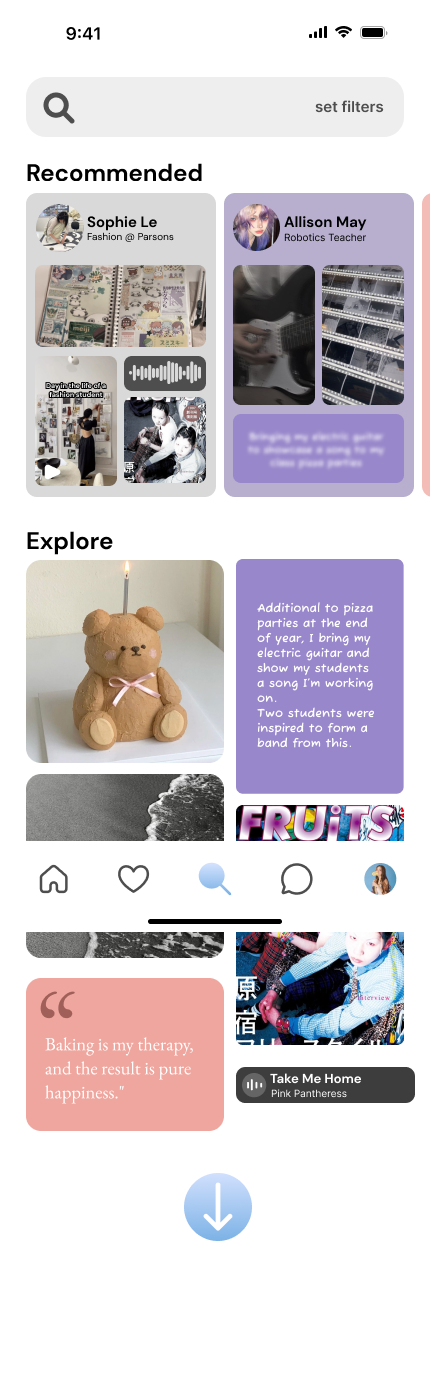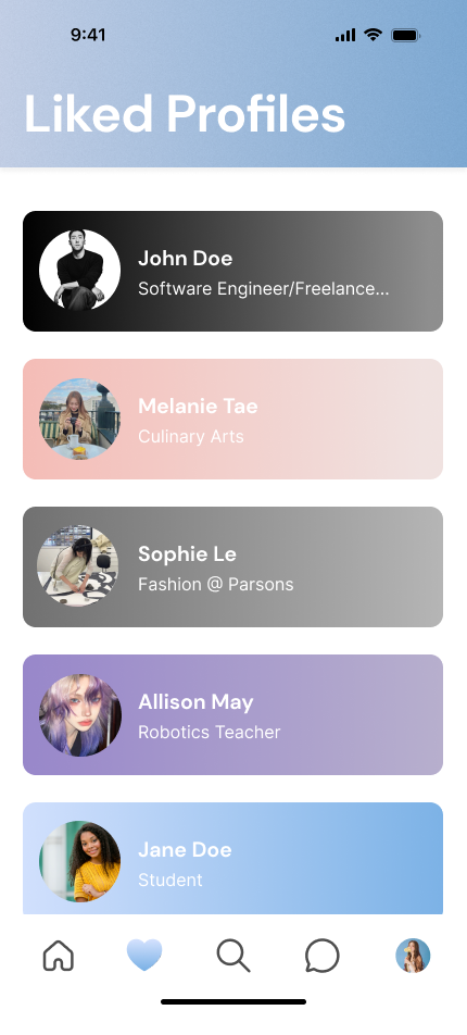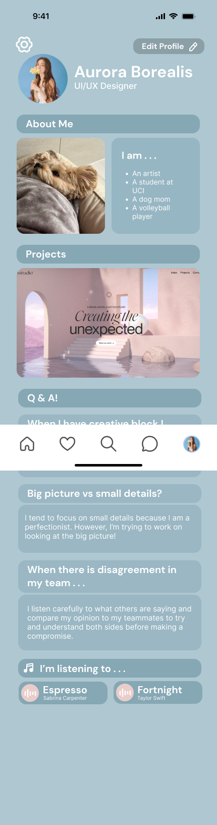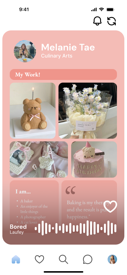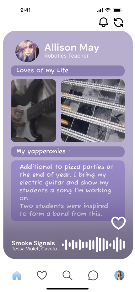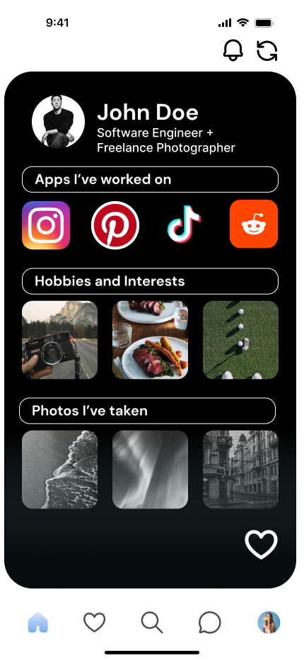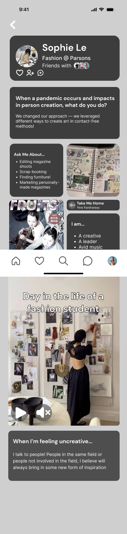 Users are first prompted to log in, and then once logged in, they will see a home page where other user profiles are recommended to them. They can scroll down to see a new profile or up to see the previous profile. Through this feature, we strive to foster a connected community where users can know each other and inspire each other. This home page is also a great way for recruiters to quickly explore many candidates and get a glimpse into their personalities/lives. Users have the option to set music for the preview of their pages when shown on the home screen, to play as others are browsing through their profile. This feature is also a great way for musicians to share their music—by setting it as the sound that plays on their profile.