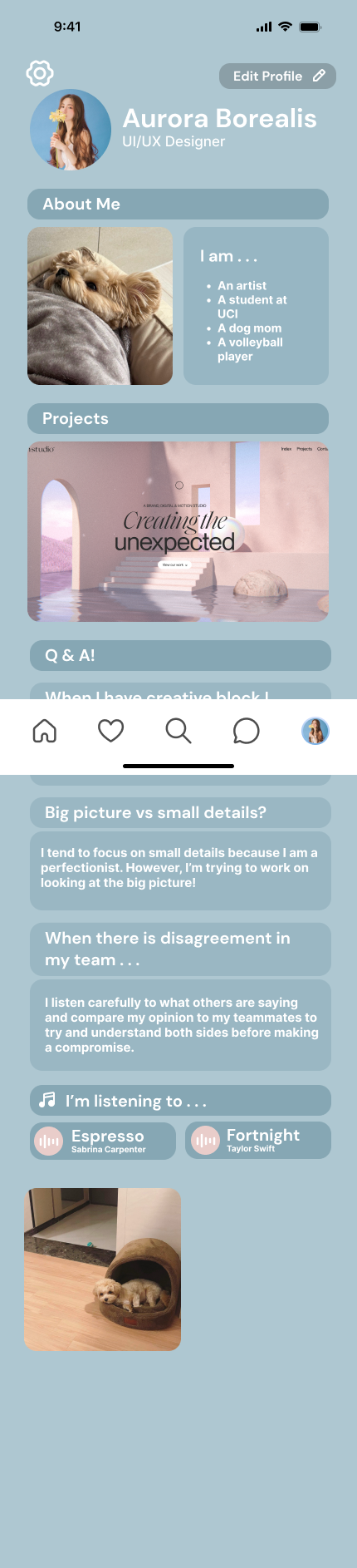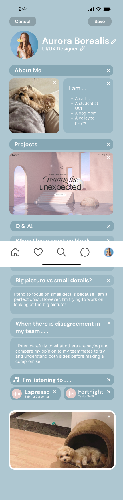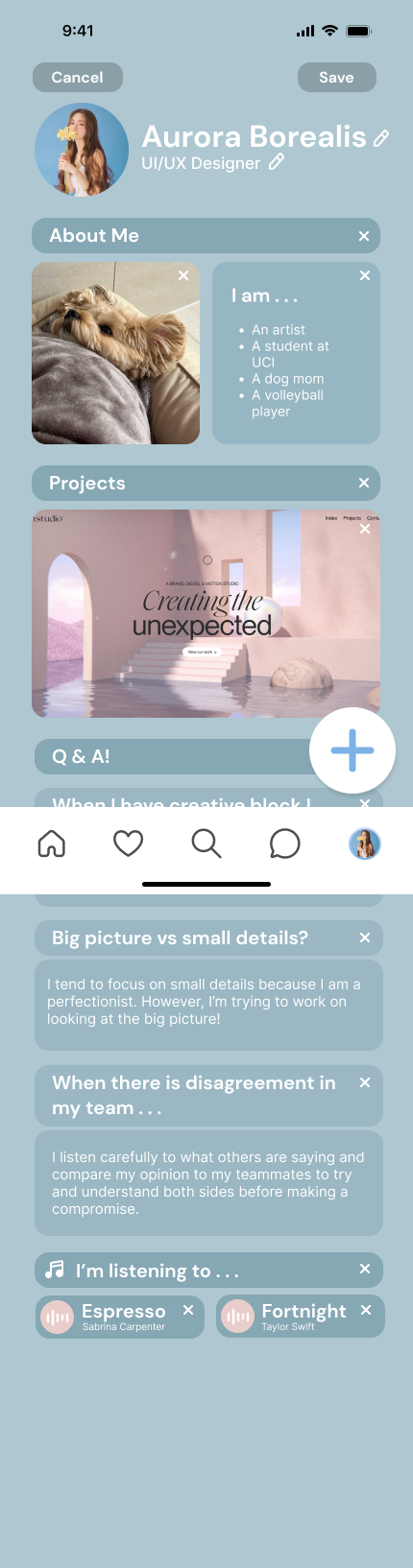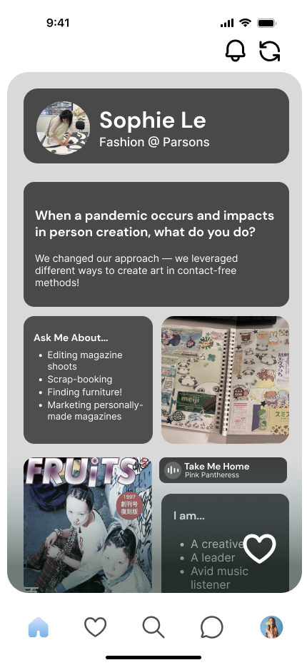 Users’ individual pages allow for the choice of color schemes and fonts that set the tone and vibe of the page. Additionally, users can include images, files, text boxes, links, and more to showcase various sides of their lives, whether that be a past project or a cute picture of their pet. Another feature that users could add to their pages is behavioral/technical Q&A, which is mainly catered towards recruiters, as they can save interview time by getting to know candidates better. A possible question could be a specific scenario and how the user would respond. The user could then link a successful project along with the answer to show that they successfully navigated that scenario. All features that the user puts out are shown as “bubbles” and can be ordered and/or sized by the user’s preference. Clicking on specific bubbles will make them pop up on the page for the viewer to see more details.