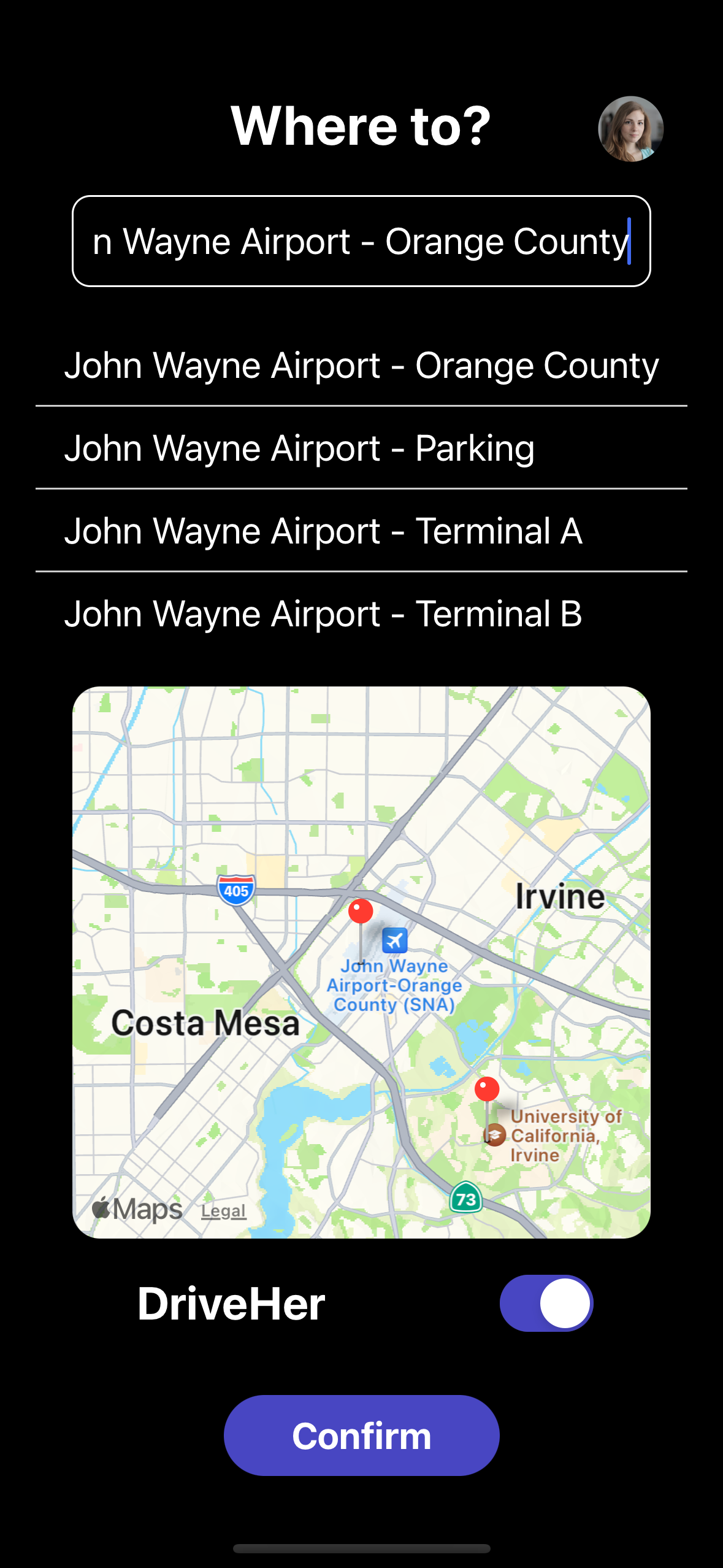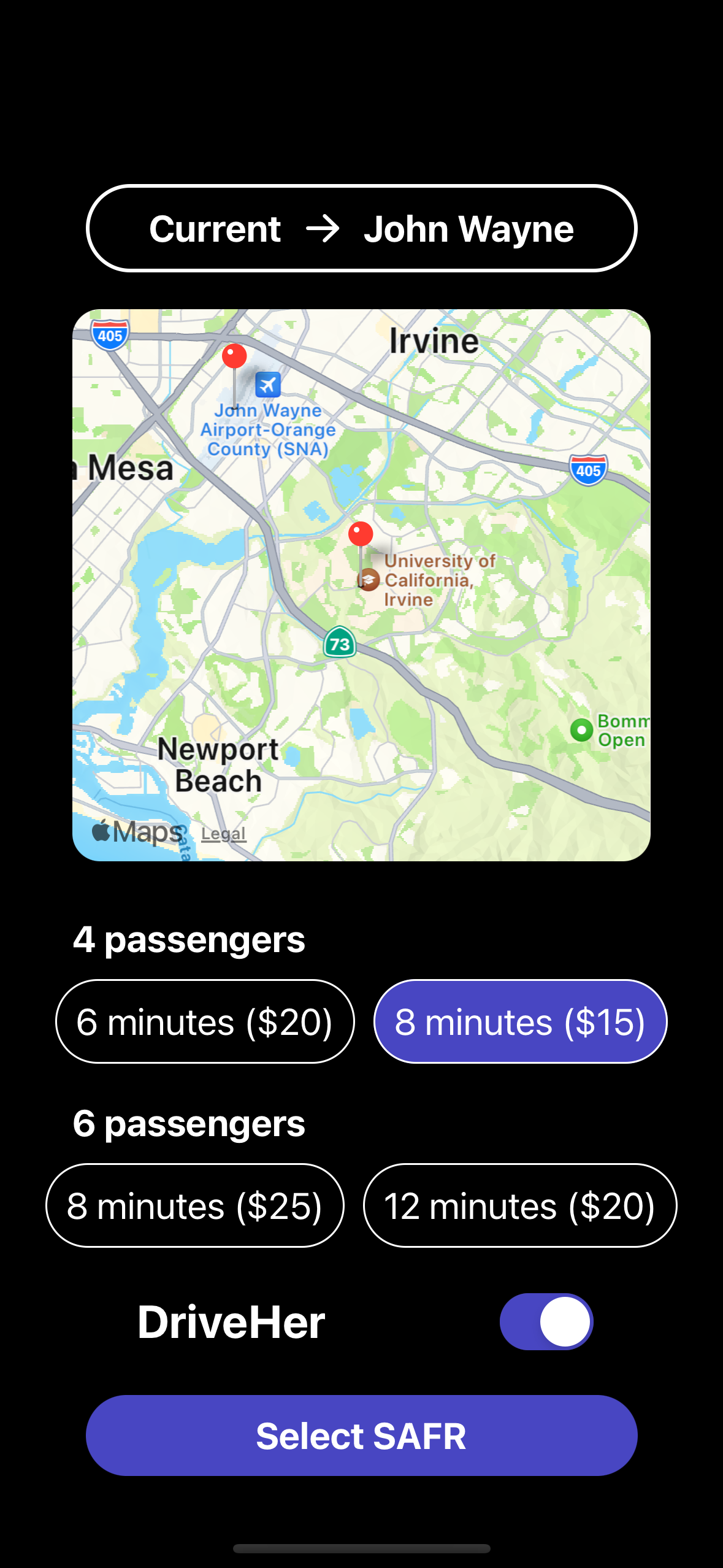 To find a ride, a user can first input their destination. They can also have the option to turn on our special feature, “DriveHer,” which offers the ability to be matched with a female driver. This feature is exclusive to female users, so they can have an extra layer of safety during their ride. Once they confirm a location, the user can select any SAFR based on arrival time, price, and number of passengers. Once they’re matched with a driver, the user can see the license plate and car model of their driver, as well as an option to view the driver’s profile to learn more about them and ease any possible anxiety about the ride or driver. They would also have the ability to cancel the ride if they feel uneasy about the driver.